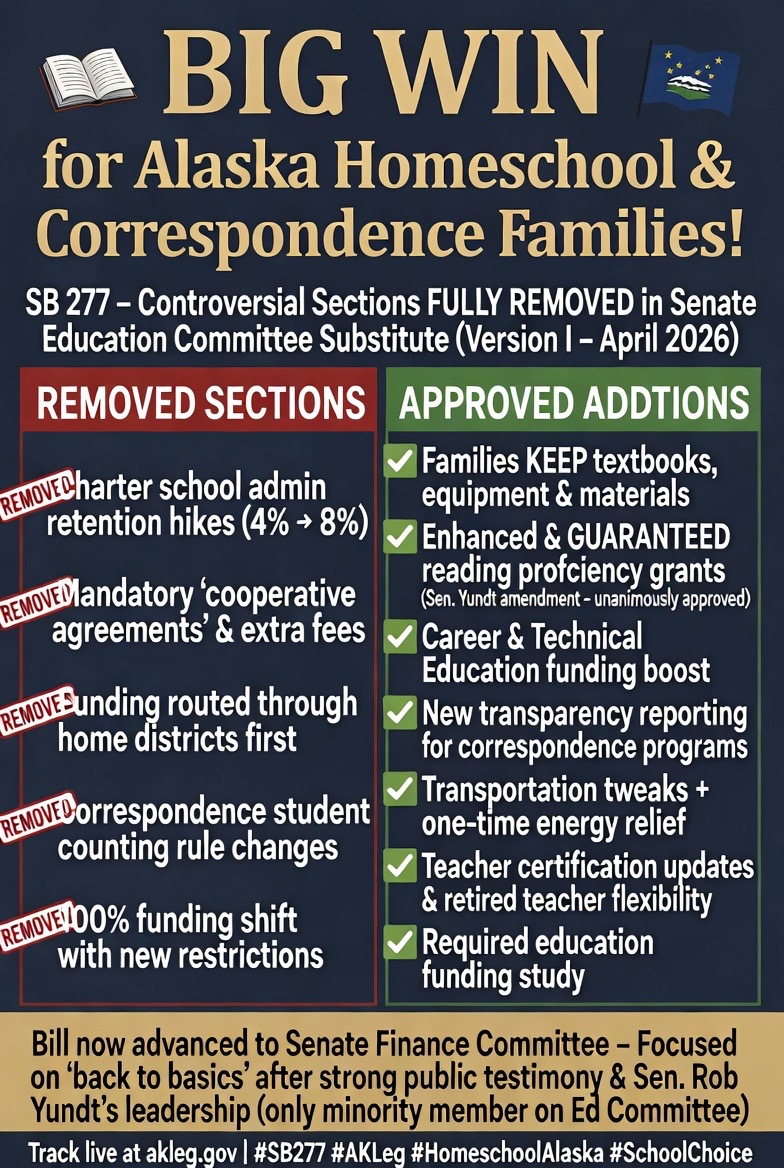Thanks to the thousands of homeschool and correspondence families across Alaska who wrote in, submitted powerful written testimony, and showed up to testify — combined with the persistent work of Sen. Rob Yundt (R-Wasilla), the lone minority member on the committee — the most damaging provisions were completely removed in the latest committee substitute (Version I). Sections that would have forced funding through home districts first, required new cooperative agreements with uncapped extra charges, doubled administrative retention on charters, and changed student-counting rules are gone. The bill no longer contains the 100% funding shift with strings attached that would have clawed back money from popular statewide correspondence programs like Galena, IDEA, and others.