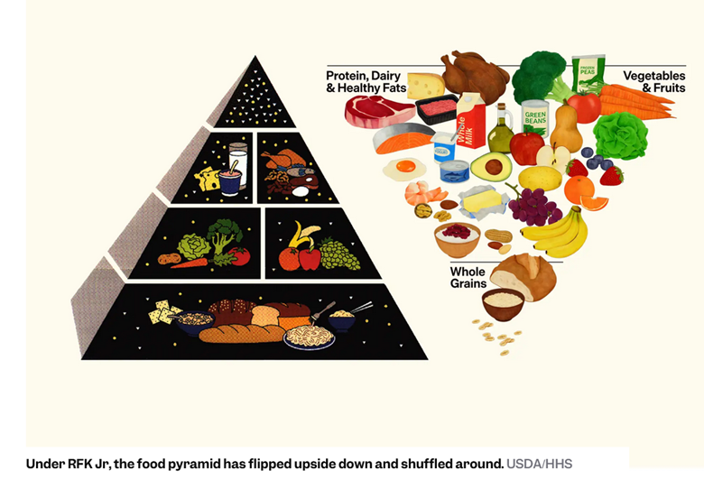 DHS Secretary Robert F. Kennedy, Jr. is re-imagining what health and healthy eating should look like. We have transformed from a low fat, high grain pyramid to one that places protein, dairy, and saturated fats at the top while putting grains at the bottom of the heap. The Department of Agriculture has released a new set of dietary guidelines, with the food pyramid of the 1990s and 2000s literally flipped upside down.